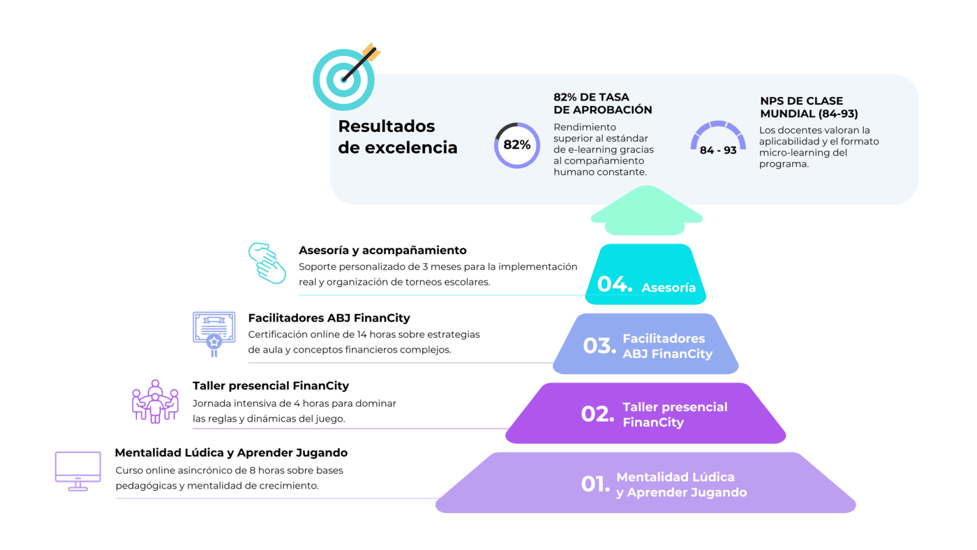 El proyecto se estructuró como un sistema de becas progresivas que permitió identificar y potenciar a docentes motivados, guiándolos por una secuencia clara: curso online inicial, taller presencial para aprender a jugar FinanCity, curso online de facilitación ABJ y acompañamiento para implementar el juego en el aula y organizar campeonatos internos.